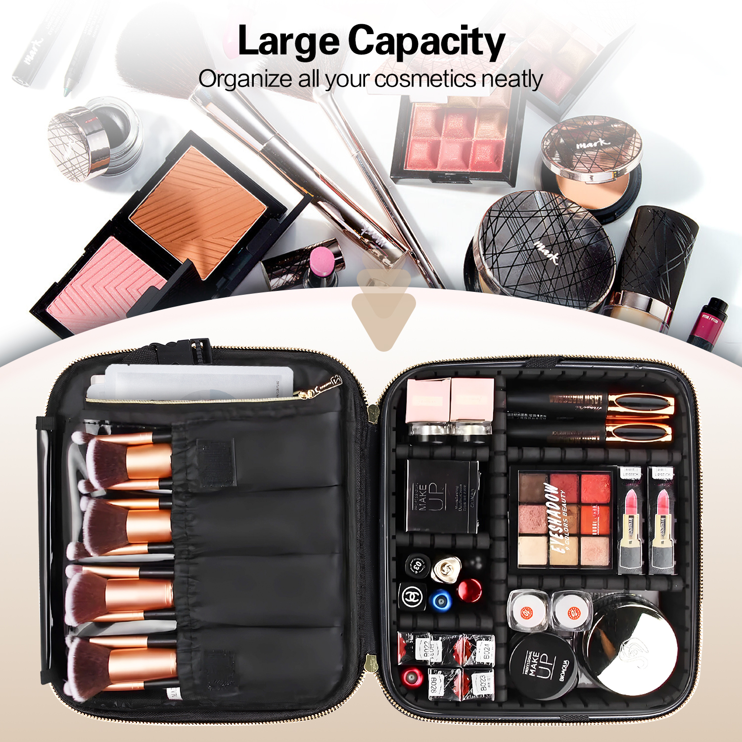 - 【Storage Space】: One hidden storage pocket with zipper; Four brushes holder pockets with lid; one bottom storage space with removable dividers.