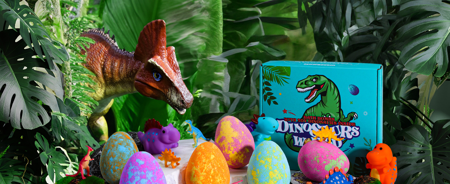 - DISCOVER HIDDEN TREASURES: Our Bath Bombs Set includes 6 large bath bombs. Immerse yourself in a magical discovery as these bath bombs dissolve, each containing a charming surprise - a cute dinosaur! But that's not all - you'll also find 2 big dinosaurs in the set, adding to the fun and excitement. Collect all 8 dinosaurs and create your own mini Jurassic adventure with your kids!
